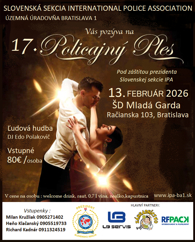 sme radi, že po roku Vás opäť budeme môcť privítať na už 17. Policajnom plese IPA, ktorý sa tento krát uskutoční v pekných priestoroch Spoločenskej sály Študentského domova Mladá Garda na Račianskej ulici v Bratislave.